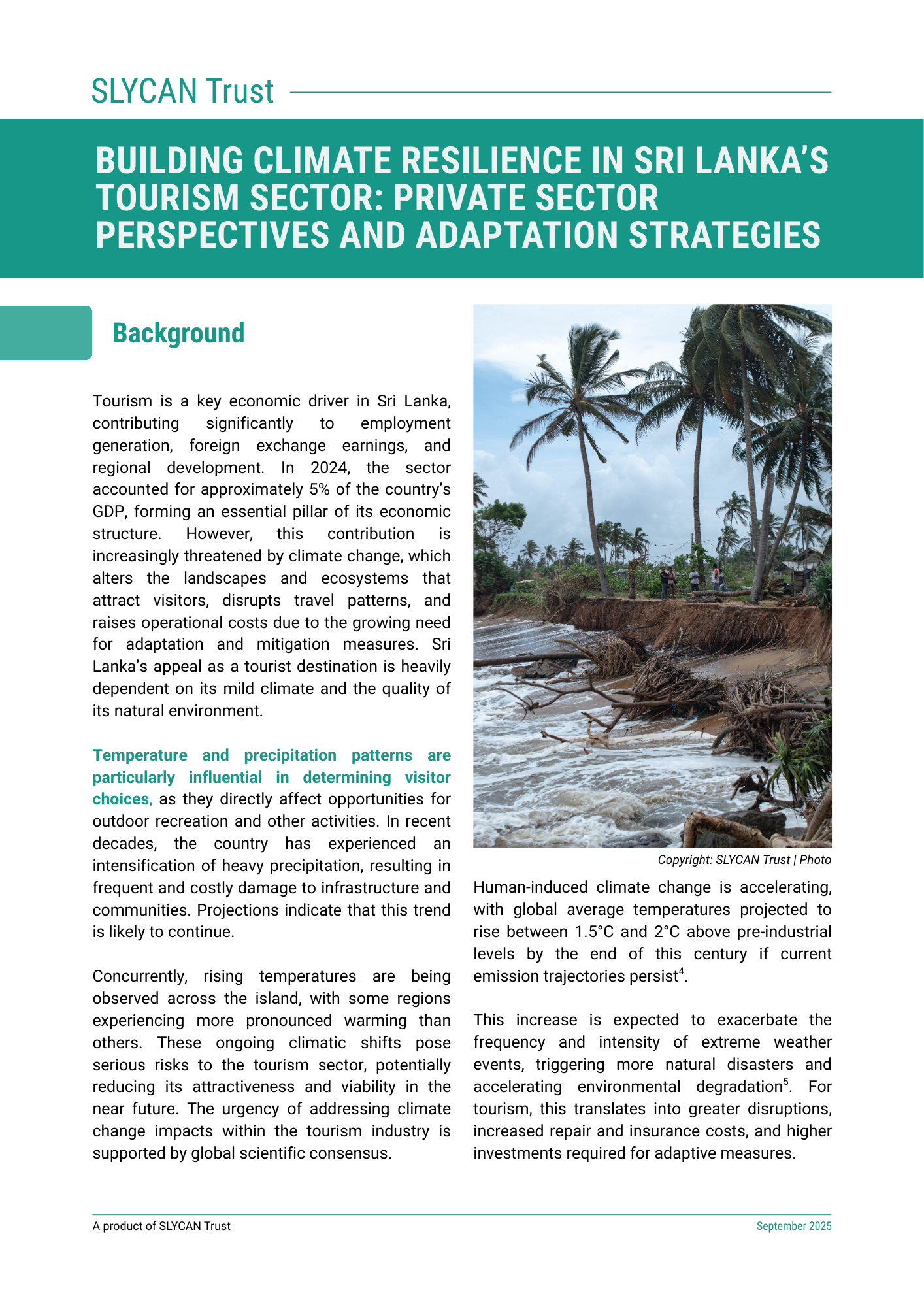Tourism is one of Sri Lanka’s most important economic sectors, generating employment, foreign exchange, and opportunities for regional development. At the same time, it faces growing risks from climate change, including altered rainfall patterns, rising temperatures, flooding, storm surges, and other extreme events that directly affect visitor experiences, infrastructure, and operating costs.