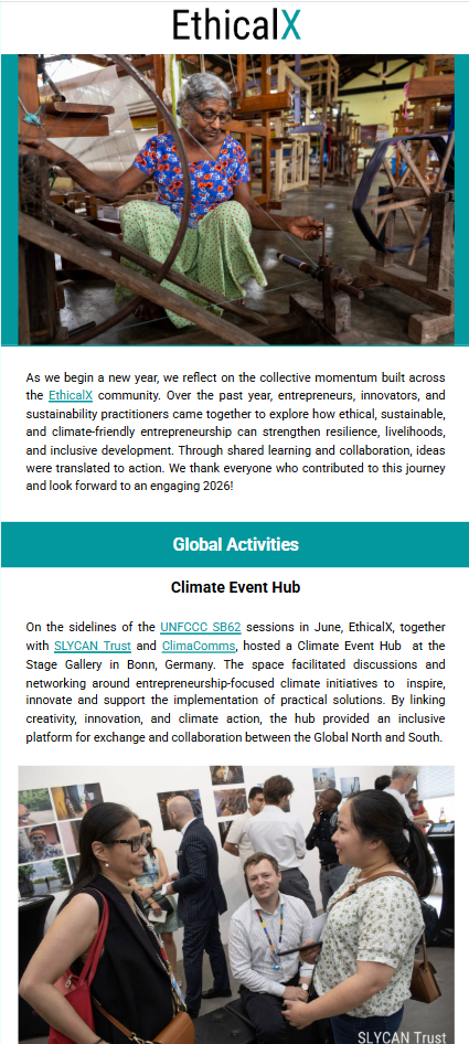 As we begin a new year, we reflect on the collective momentum built across the EthicalX community. Over the past year, entrepreneurs, innovators, and sustainability practitioners came together to explore how ethical, sustainable, and climate-friendly entrepreneurship can strengthen resilience, livelihoods, and inclusive development. Through shared learning and collaboration, ideas were translated to action. We thank everyone who contributed to this journey and look forward to an engaging 2026!