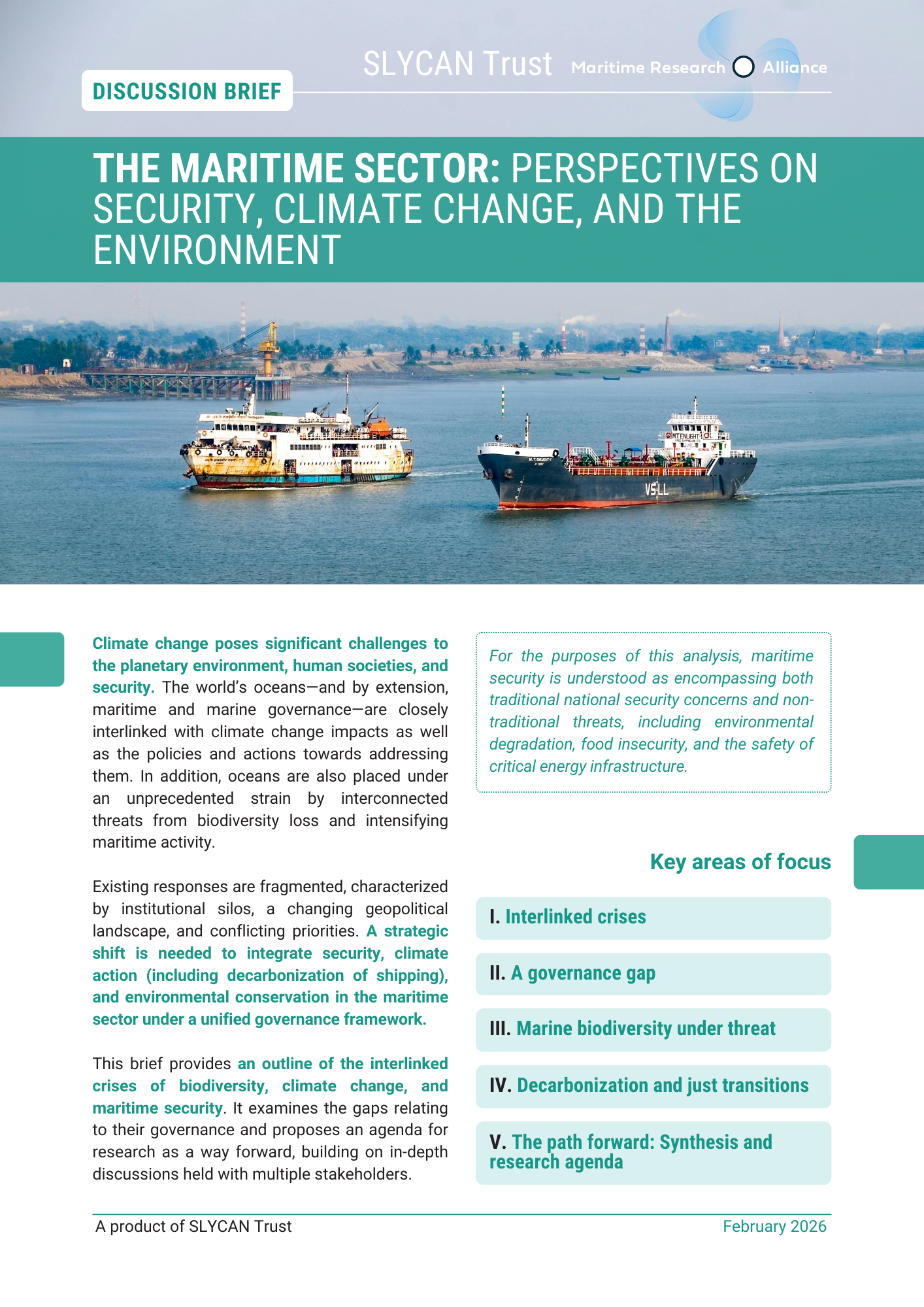 Climate change poses significant challenges to the planetary environment, human societies, and security. The world’s oceans—and by extension, maritime and marine governance—are closely interlinked with climate change impacts as well as the policies and actions towards addressing them. In addition, oceans are also placed under an unprecedented strain by interconnected threats from biodiversity loss and intensifying maritime activity.