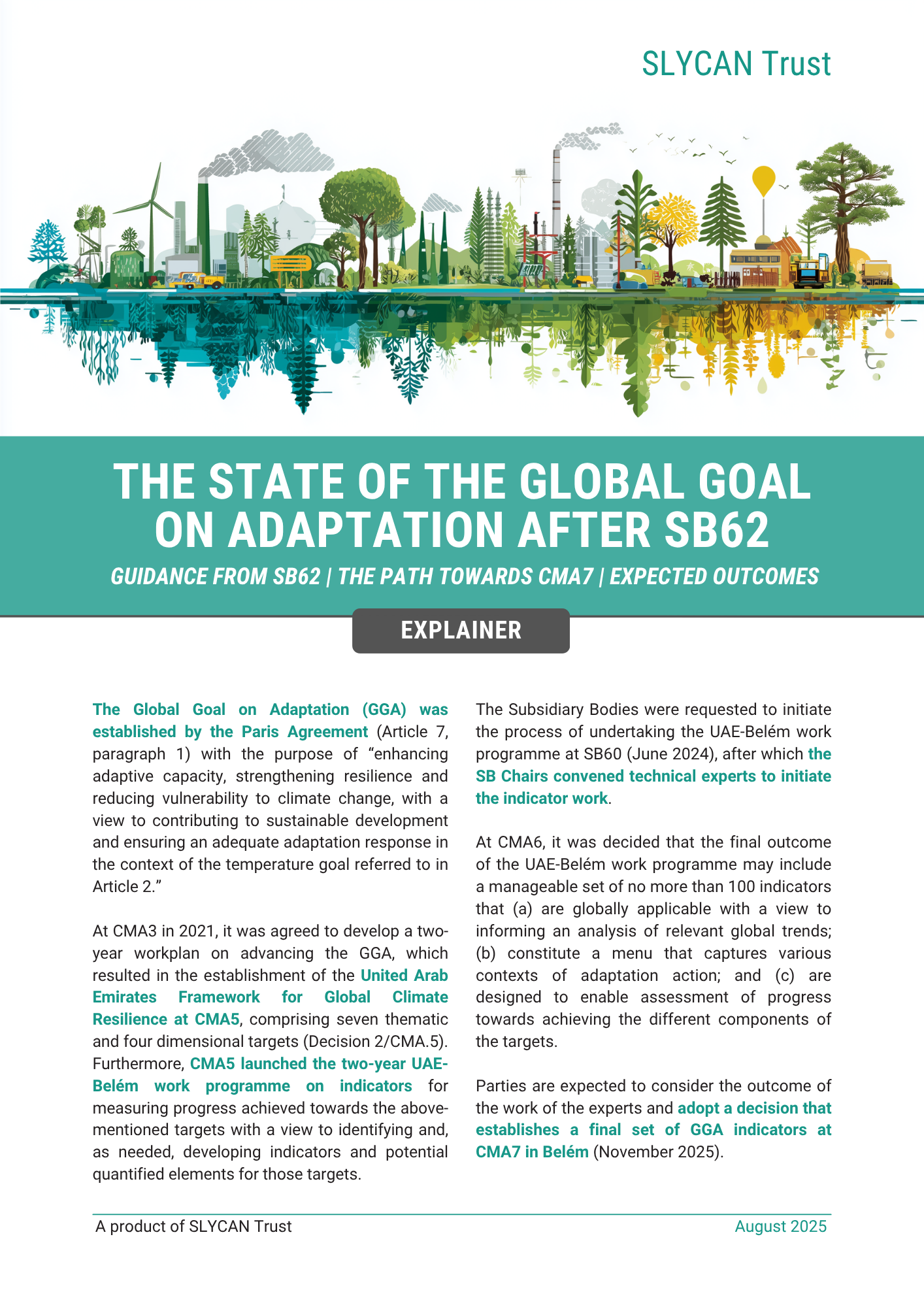 This explainer offers a concise overview of the current state of negotiations on the Global Goal on Adaptation (GGA) after of SB62 in June 2025, including summarised information on how Parties, experts, and other actors are working to develop indicators and address a range of cross-cutting and emerging issues.