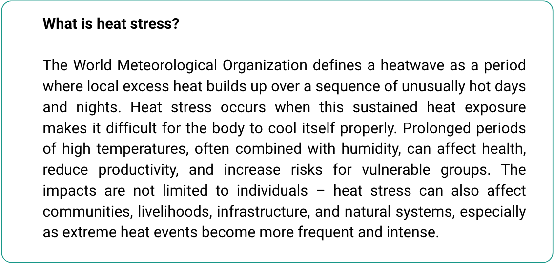 As the global climate continues to undergo unprecedented changes, the rise in average global temperatures increases the threat of heat stress (Climate Risk Index 2025: Germanwatch). Caused by extended periods of high temperatures and humidity, heat stress poses multifaceted challenges that transcend geographical boundaries, affecting vulnerable populations, ecosystems, labour productivity, and economic stability.