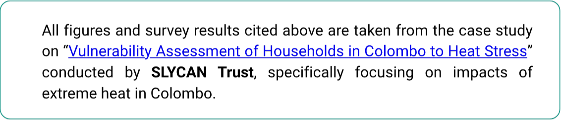 Based on this case study, extreme heat has a profound impact on communities in Colombo. Findings indicate that the majority of surveyed households reside in small dwellings consisting of only one or two rooms (Madurasinghe et al., 2023). The structural composition of these houses acts as a primary heat trap, with many households using asbestos sheets for roofing, while others rely on galvanized iron/tin sheets. As these materials absorb and radiate intense heat, most residents report that rising temperatures disproportionately affect vulnerable family members, including children and the elderly.