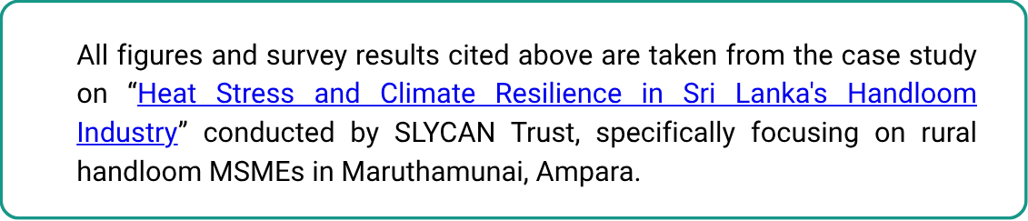 The case study found that extreme heat has become a significant disruptor of traditional work cycles in the handloom sector, particularly during the seasonal temperature spikes observed from April to July. During these peak periods, extreme heat often forces weavers to reduce their total working hours to avoid physical strain. The study reveals a steady upward trajectory in WBGT, which incorporates air temperature and humidity to assess physiological strain. Based on the WBGT analysis, peak stress conditions occur between April and July, with values frequently exceeding the threshold of 31°C associated with severe heat stress, discomfort, and a higher risk of heat exhaustion (SLYCAN Trust, 2025).