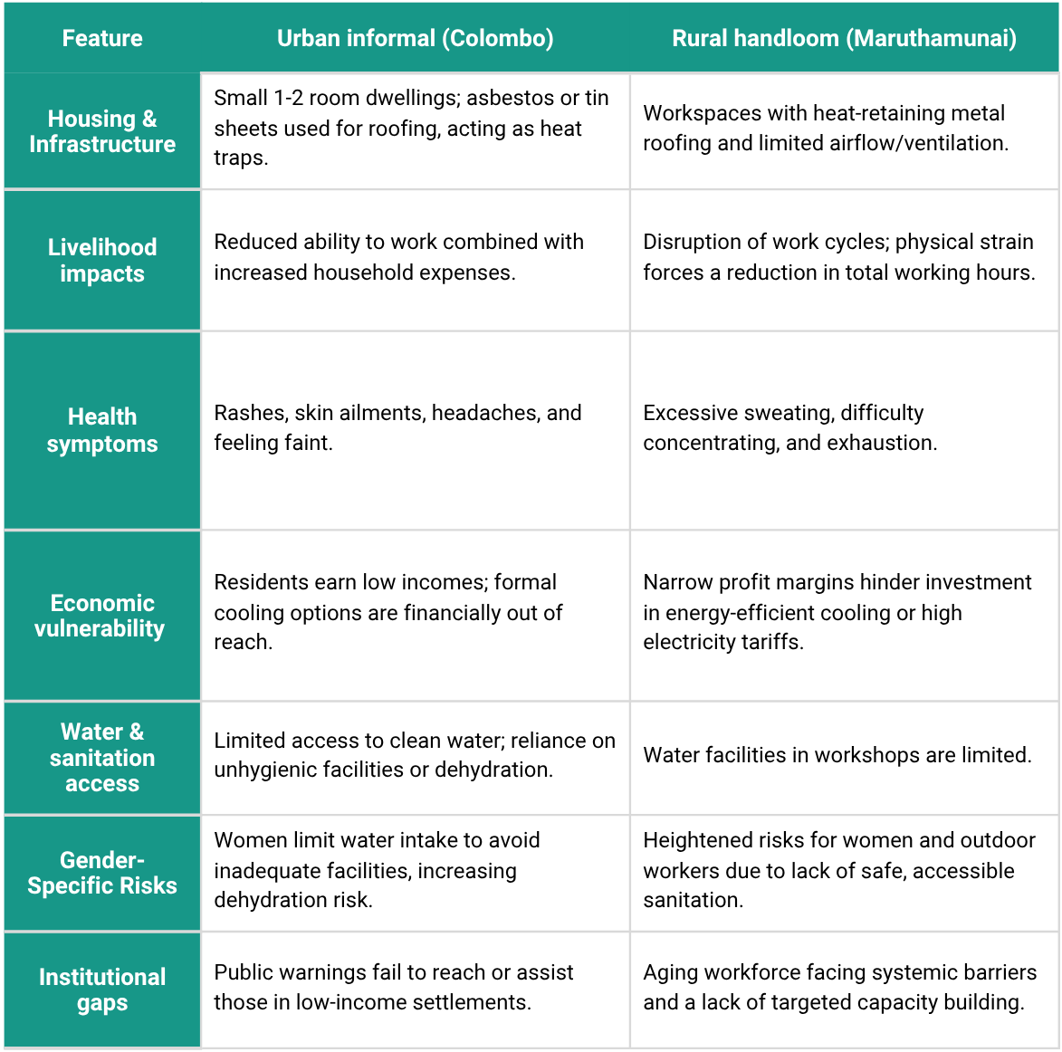 Extreme heat creates a dangerous heat trap for both communities in urban informal settlements in Colombo and rural handloom weavers in Maruthamunai. This environment forces a difficult choice between health and livelihoods, as physical strain and exhaustion lead to reduced working hours and diminished incomes for already vulnerable families. Furthermore, the lack of adequate infrastructure and safe sanitation creates specific risks for women, who often limit their water intake and thereby exacerbate the danger of dehydration. Ultimately, both communities face systemic barriers where narrow profit margins and a lack of targeted institutional support prevent them from accessing the cooling solutions necessary to survive rising temperatures.