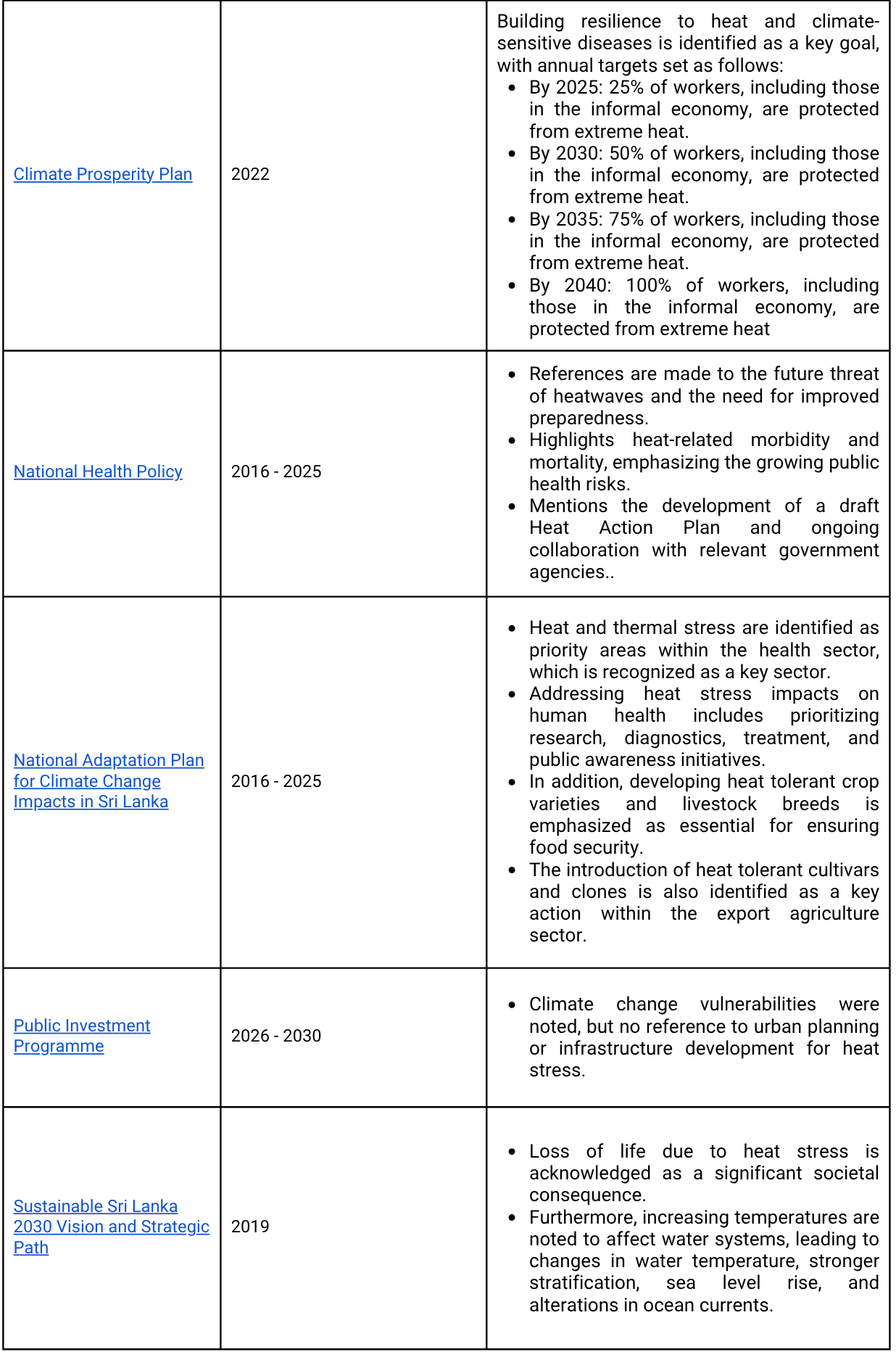 Sri Lanka’s existing climate and labour policies provide a partial foundation for addressing heat stress, while global frameworks highlight the growing urgency of heat-related risks. However, these frameworks tend to address heat stress indirectly, with limited integration across sectors such as health, labour, and urban planning. The table below outlines key policies and legal frameworks in Sri Lanka that are relevant to heat stress impacts. Nevertheless, there remains a significant gap in policy integration and coordination needed to effectively address heat stress in a comprehensive manner.