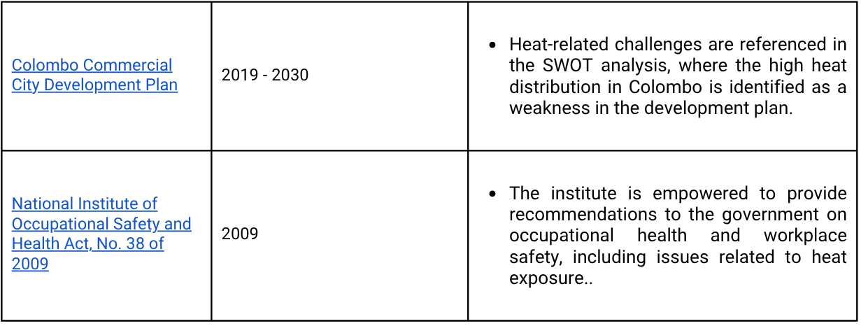 Table 2: Analysis of relevant policies and laws in Sri Lanka related to heat stress